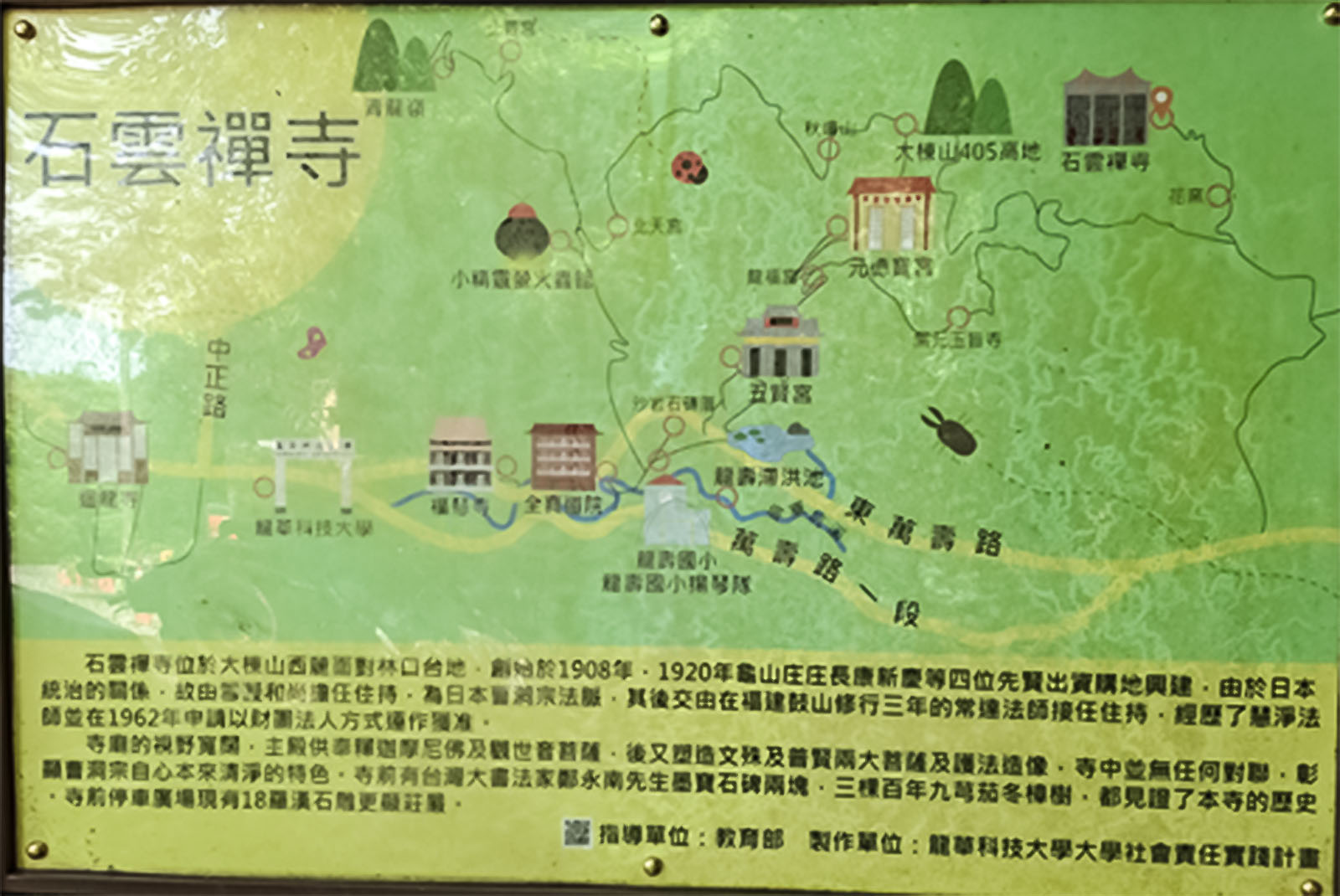 石雲禪寺,位在桃園市龜山區兔坑里石雲路338號,地點在山仔腳山塊南側斜面大漢溪支流兔仔坑溪谷中,海拔約220公尺。清代時期為龜崙社後方之地,因名社后坑。在早期此處因生產木炭而改稱「炭坑」,日治時期因諧音而訛為「兔仔坑」。 石雲禪寺後有山形屏風,前庭廣闊,展望極佳,有太師椅的風水格局。明治40年(1907),採石灰礦挖到一塊狀似觀世音菩薩的石頭,請石工雕刻觀世音菩薩神像後,搭一間草茅供奉膜拜,庇佑採礦平安。大正10年(1921),首任住持釋雪凝法師主持寺務,為日本曹洞宗法脈,命名為石雲寺。有另一說法,因為鄰近有石灰坑,所以命名石雲寺。後來於基座後方岩石上刻上佛字。目前石雲寺後方還保留著日治時代的遺跡,石壁上可見大大的佛字,此處還保留洞穴及石桌椅等,不難想像過去僧侶在此打坐念經的模樣。 石雲寺曾入選臺灣歷史建築百景中桃園預選的20名名單。環境清幽雅致,全寺無一佛語對偈,是一大特色。廟埕有「山水有靈」、「紀念碑」兩塊石碑,係日治時期桃園縣籍名書法家鄭永南所書,為廟方重要文物之一,相當具有歷史意義。 參考資料: 龜山區公所、桃園觀光導覽網-石雲步道 https://travel.tycg.gov.tw/zh-tw/travel/attraction/1610 石雲禪寺總幹事劉孟嘉導覽整理