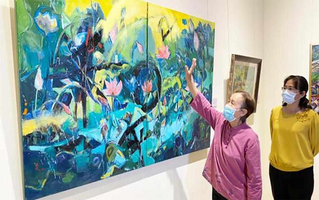 「中興莊從西側幼稚園看過來,整個山牆高高低低,大小不一,有加建的、有擴充的,錯落有致,但整個灰色調,有點憂鬱,歷經滄桑。利用幾何圖形簡化,抽象加上歡愉的色彩。」