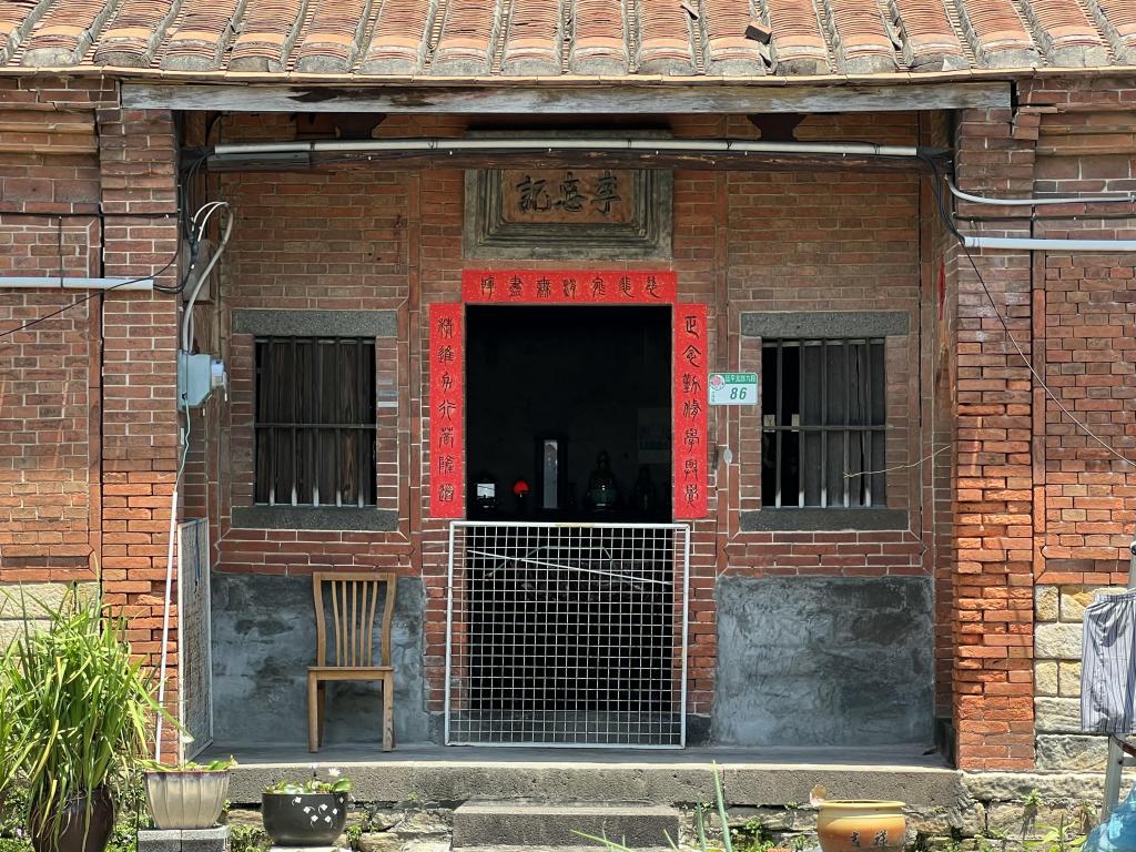 李忠記宅為兌山李家後裔宅邸,創建於清光緒年間(約19世紀末),由李九世(1857–1928)興建;日治大正年間再度擴建,由「三間起」增為「五間起」,並陸續加建左右護龍,形成雙護龍三合院的格局。 建築形制採五開間「凹壽」配置。正身外牆上段為紅磚荷蘭式砌法,下段以石材平砌基座,簷下施疊澀磚,山牆尖端鑲綠釉花磚通氣窗。正身水車堵設十字形氣窗,室內隔間多為編竹泥牆,並見鏤空花窗通風採光。全屋為磚—石—木混合構造:外牆以紅磚承重,內部採穿斗(混抬樑)式木構搭配木作屏壁;屋頂為磚造圓桁體系,正身另設內廊串聯空間,形制古樸而完整。 地基與材料則呼應在地環境與防災需求:正身與護龍基礎以唭哩岸石抬高並設踏階,減少外水入侵;院落及地坪鋪設觀音山石,堅實耐用;屋身並設半樓仔(閣樓),作為儲物與洪水來時的臨時避險層。整體構造兼具抗風、通風與防潮,為社子島傳統聚落中保存狀況良好、且能體現地方工法與生活智慧的重要宅院。