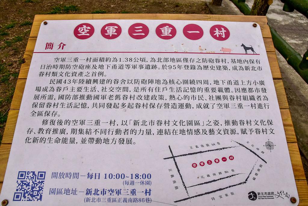 該園區內有日本統治時期遺留下來的地下俑道與防砲工事,也有國民政府眷村中反共的建築氛圍。為了保存三重在地的眷村文化,因而改建成眷村文化園區,介紹空軍和其家屬居住的地方,也是人們了解北部眷村文化的重要地點之一。