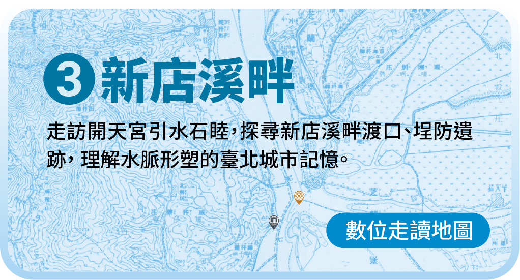 「新店溪畔走讀」是一場沿著碧潭與老街,追尋新店水利與生活史的路上課。從「瑠公史蹟紀念碑」出發,實地看見上游取水的工程智慧:石笱抬水、引水石腔過壁與瑠公圳原址;再走入廟市相依的日常,在「開天宮」「長興宮」讀祈安與市集的脈動,於「新店渡」理解對渡網絡與交通記憶,並在「新店堤防一號」對照近代治水。最後於「大坪林圳」與「通學橋」,復原巷底水路與學童步行的歷史動線。