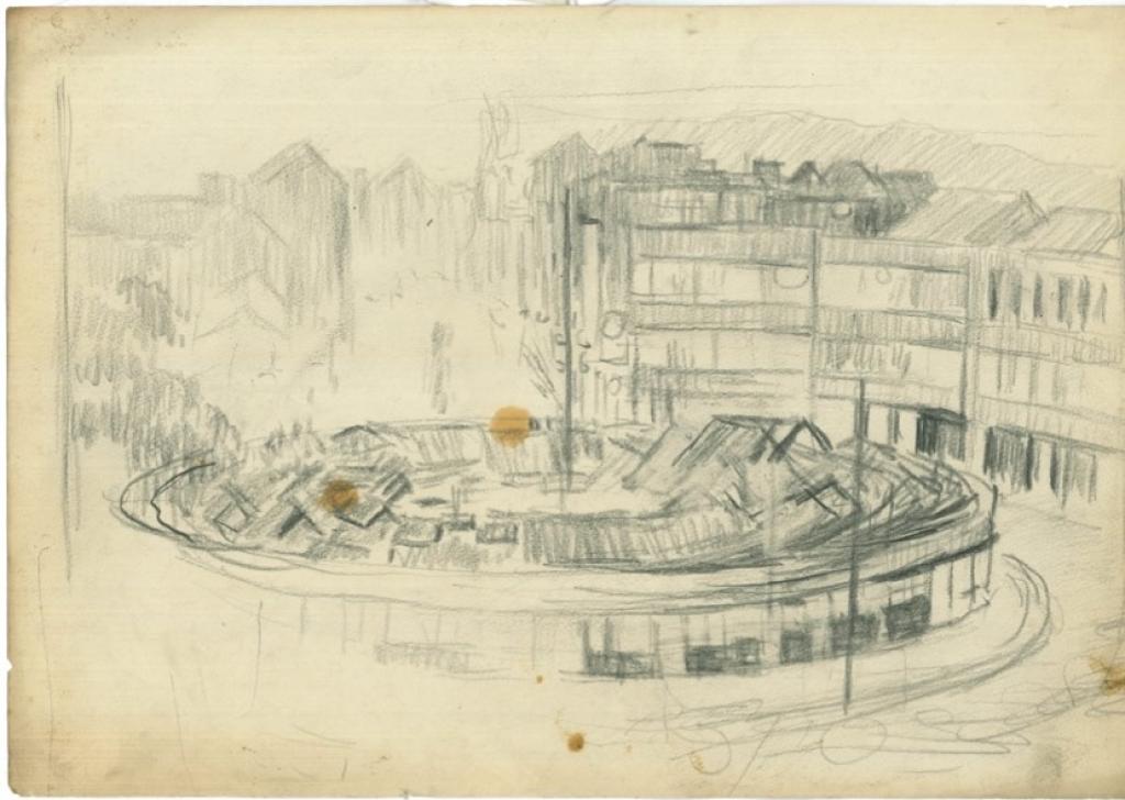 在這幅作品中,我們可以看到圓環周邊的建築和人們的日常生活。建築物用粗獷的筆線條勾勒出來,營造出一種獨特的氛圍。圓環中心的交通流動也被生動地刻畫,展示了當時的城市節奏和活力。