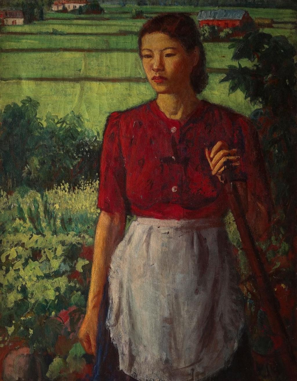 1937年七七事變爆發,原本由臺灣教育會主辦的臺灣美術展覽會(臺展)暫停一年,1938年改由臺灣總督府文教局直接辦理,改名為臺灣總督府美術展(府展)。當時作為府展最有影響力畫家之一的飯田實雄,向參與府展畫家大力鼓吹「聖戰美術」,然李梅樹並無響應飯田實雄的呼籲,依舊以自身生活周遭事物為主要畫題。李梅樹自1943年開始擔任三峽壯年奉公團團長,1942年至1945年擔任三峽茶葉組合長、代理街長等,這時的李梅樹更常接觸家鄉勞動階層,並繪製了一系列的田園人物作品。