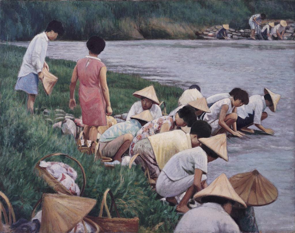 1981年,李梅樹創作了《清溪浣衣》一幅尺寸為50P(116.5×80cm)的油畫作品,畫作地點位於中埔溪接三峽河處,近長福橋附近。這幅畫作描繪了三峽的婦女在河邊洗衣的情景,呈現出寫實的作品。三峽的婦女早期經常在河邊洗衣,這不僅是為了洗濯衣物,也是她們聯誼、溝通的機會。畫面中的婦女有些蹲在河邊,有些則似乎是洗完衣服後正在和旁邊的婦女聊天,使整體畫面更具生動感。 從畫面中可以看出,河面呈現出S型的構圖,而婦女被分為兩群,一群位於畫面前方,另一群位於畫面後方,這樣的構圖形塑出了河面寬廣的感覺。左上角的陰影處,光線變化處理十分豐富。李梅樹運用了大量的光影變化,塑造出了流水感和水波紋。透過水波紋的多少可以反映出河水的深淺,例如,從畫面中間靠右邊的位置有大量的水波紋,顯示出河水較深;而在婦女腳下的水波紋較少,則呈現出水淺的情況。 《清溪浣衣》與李梅樹1970年創作之《河邊清晨》相比,運用了更多溫暖色調,河岸邊的草堆也因陽光照射而呈現出金黃色效果。可看出李梅樹晚年的創作重心不僅在於描繪人物,更注重捕捉人與大自然之間光線變化的瞬間。 參考資料: 李梅樹官方網站https://limeishu.org.tw/intro/museum/5b8e97c049454bae17185cf8 台灣教育研究資訊網 李梅樹(1902~1983) - 獨「樹」一格的美術教育家 清溪浣衣- 李梅樹數位藝術館 http://www.iicm.org.tw/art/LiMetShu/pic.asp?num=47