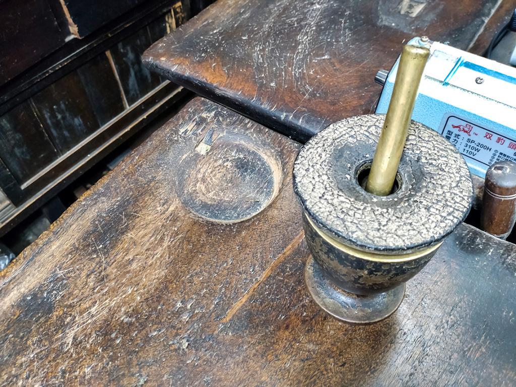 進入店裡,首先看到懸掛於兩旁的對聯:「恆心久擅岐黃術,德澤長生桔杏春」,昔時的大紅紙在時光推移下也已褪成泛白。店裡兩側分別擺放不同年代的中藥櫃,早期的進口人蔘鐵罐,散發著舊年代的養生味道;明亮的中藥白瓷瓶,依然承裝著救人濟世的慈悲心腸;店內兩張大而寬的長板凳,可以見到店家體貼來訪民眾的心意,板凳上放著一張切削藥材的切刀臺,厚約10公分的底板,黑得發亮,吸附著百年來的甘甜滋味;一旁約4尺高、7尺長的百年木櫃,右方一角凹下一圈深深的圓孔,是歷代主人為客人以銅缽捶製藥品的真實見證。