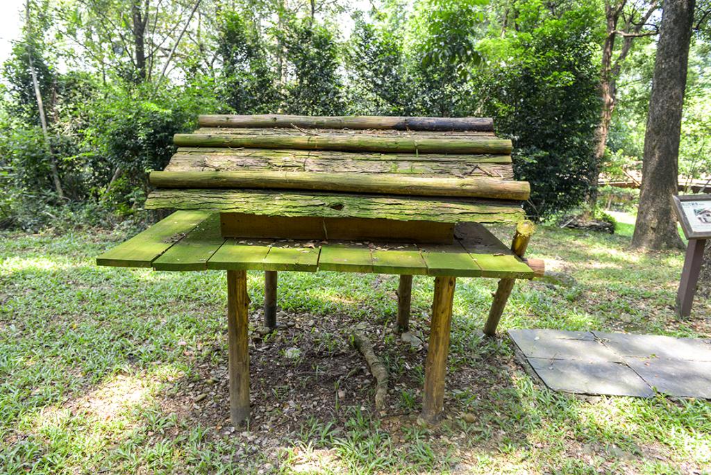 Originally built in Datong Township, Yilan County, it is a half-underground house with a thatched roof and wooden walls. Firewoods are stacked around the house, which serve as a wind protector. There is a woven bamboo bed at each corner in the house. The bed on the right is for the eldest couple in the family, and on the left is for women and children.