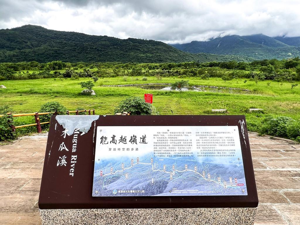 生態環的設計者將海洋生物用藍色呈現,陸地生物則以綠色表示,凸顯各種生物的立體特徵。這座生態環象徵了木瓜溪的自然故事,展現了森林、河川與海洋的生態連結。護岸的高灘地上另設有一座台灣形狀的生態池,象徵初音作為「能高越嶺道」東部起點的歷史意義。能高越嶺道原為原住民的遷徙和交易道路,連接中央山脈的東西兩側。日治時期,這條道路被整治為警備道路,成為台灣第一條東西橫貫公路,全長81.3公里,連接東部的初音與西部的霧社。這條道路不僅具有歷史意義,還成為1950年代台電輸送東部電力到西部的重要路徑。